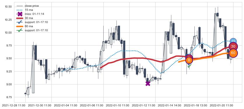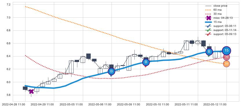 上涨趋势05-10 13:00-06-07 15:00,均线60, 30确认关键支撑4处