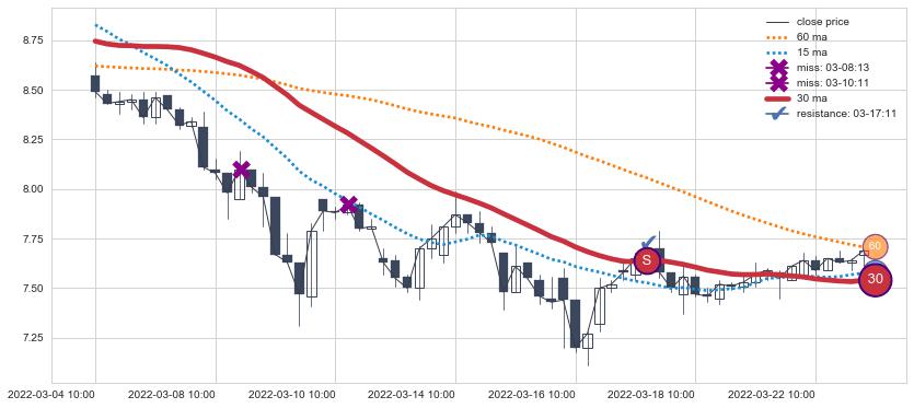 下跌趋势03-04 10:00-03-23 09:00,均线30确认关键阻力1处