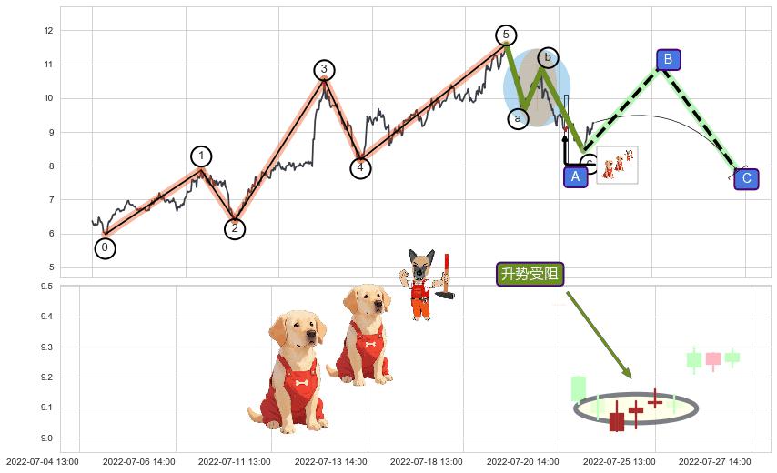 | 3 🅚:顶部尽头线(下山虎) ➕ 🌊:波浪理论猜想上涨浪5已形成,猜想后续形成回调abc下跌(均值回复) ☞ 看空信号 ⇥ 【🅚线】交织【图形】⇥ 综合量化分数: 46 | > |