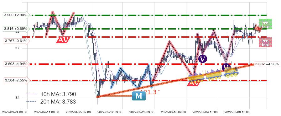 ♘ 阻力价格位3.816,可信任强度76.77%,距离最后交易2022-08-12 14:00形成的收盘价格3.790相差 +0.69%