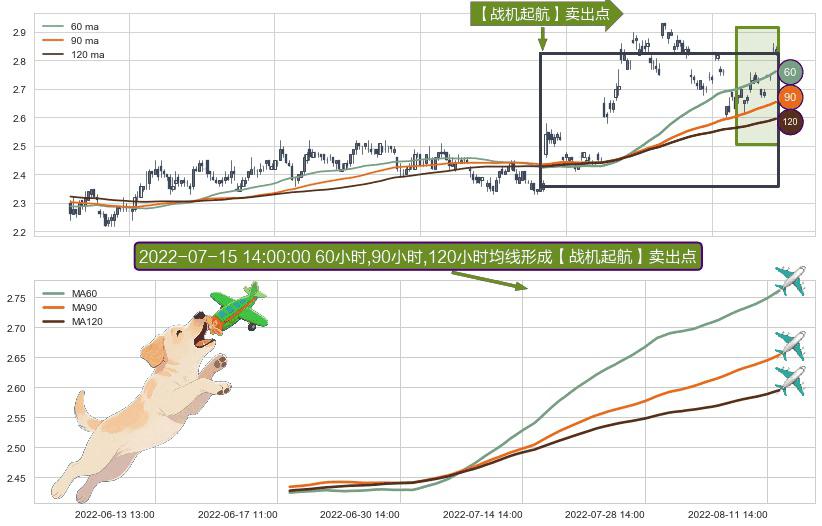 ⚀ 2022-06-17 14:00:00小时-2022-08-12 14:00:00小时显现 60小时-90小时-120小时均线 【战机起航】卖出点 看空信号,后市看跌,卖出