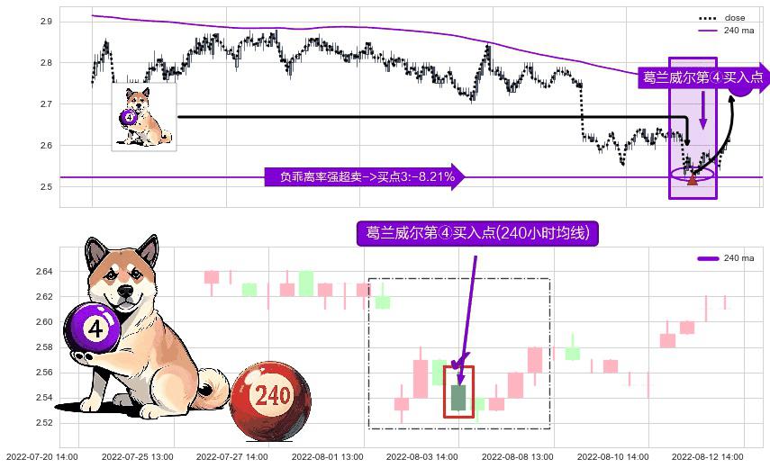 形态多维评估: ⚀ 2022-08-03 14:00:00-小时显现 葛兰威尔均线 240小时均线 第④买入点 下降趋势均值回复的短线反弹信号,后市看涨,买进信号