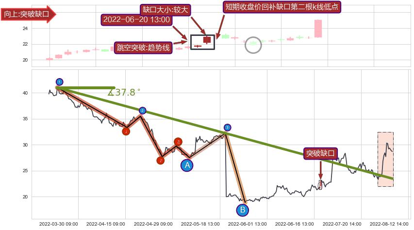 从2022-03-23 13:00至2022-06-06 13:00,共包含233个小时,阶段股价下跌-54.77%,阶段股价变动位移路程比: 1 : 4,下跌趋势角度: 37.8,2022-05-20 09:00向↘︎形成缺口,跳空下跌-38.03%˚