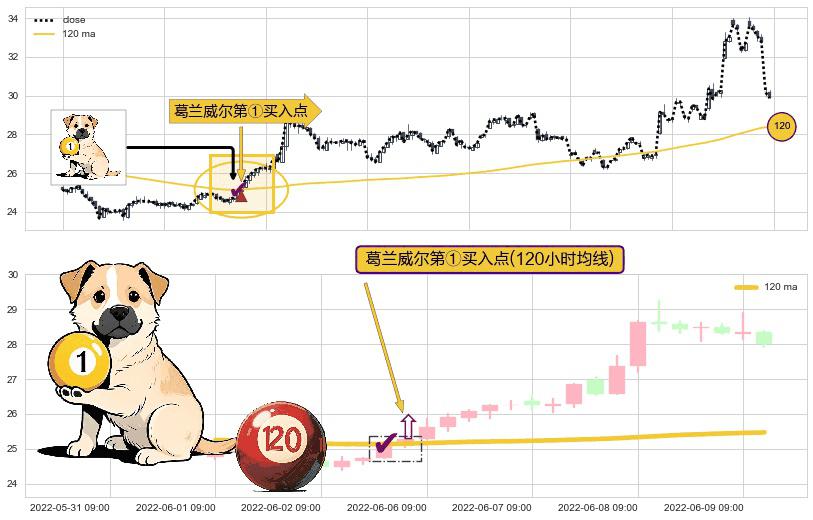 形态多维评估: ⚀ 2022-06-02 14:00:00-小时显现 葛兰威尔均线 120小时均线 第买①入点 走势反转见底信号,后市看涨,买进信号