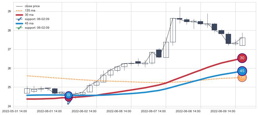 上涨趋势05-31 14:00-06-10 09:00,均线45, 30确认关键支撑1处