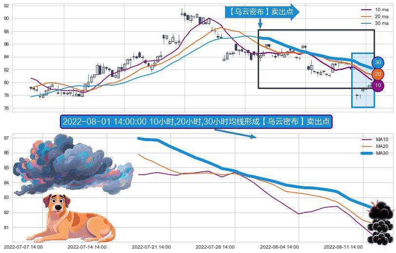 ⚀ 2022-07-19 13:00:00小时-2022-08-12 14:00:00小时显现 10小时-20小时-30小时均线 【乌云密布】卖出点 看空信号,后市看跌,卖出