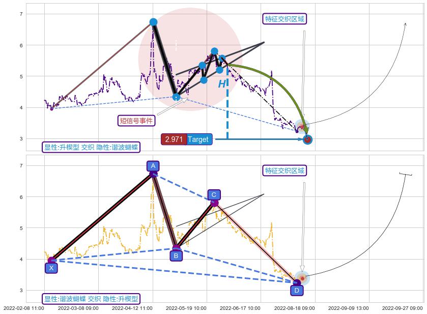| 4 🅚:【高山滑雪】买入点 ➕ 📡:谐波蝴蝶已到达d点:猜想c下行到达d点后报复性拉升上涨(均值回复) ☞ 看多信号 ⇥ 【均线】交织【图形】⇥ 综合量化分数: 52 | > |