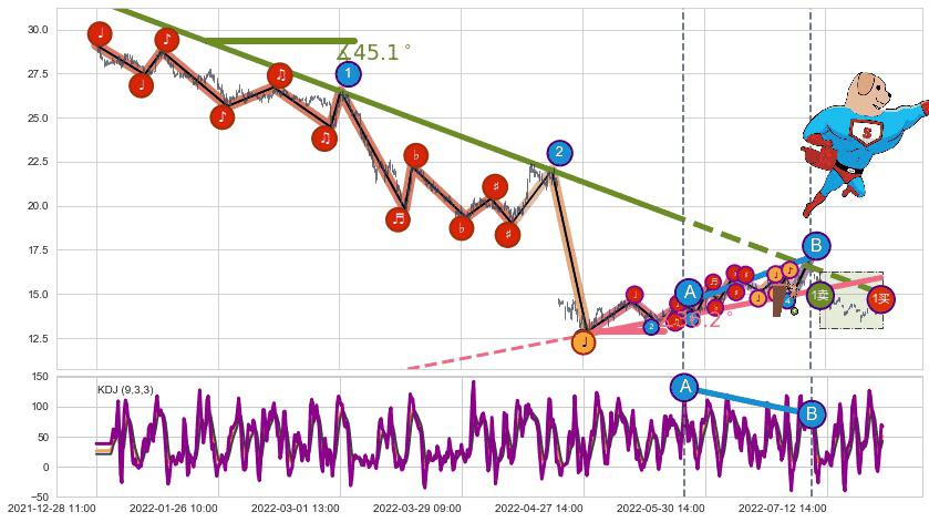 ➣ 2022-04-28 13:00-2022-07-13 14:00上升趋势存在反转[风险],其原上升趋势的支撑位(15.92)已破位[强阻力信号],原上升趋势角度: 36.2˚