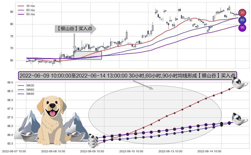 ⚀ 2022-06-09 11:00:00-小时至2022-06-14 13:00:00-小时显现 30小时-60小时-90小时均线 【银山谷】买入点 看多信号,后市看涨,买入