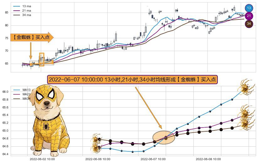 ⚀ 2022-06-07 10:00:00小时显现 13小时-21小时-34小时均线 【金蜘蛛】买入点 看多信号,后市看涨,买入