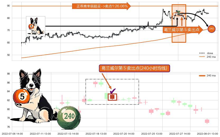⚀ 2022-07-18 14:00:00-小时显现 葛兰威尔均线 240小时均线 第⑤卖出点 上升趋势均值回复的短线回落信号,后市看跌,卖出信号