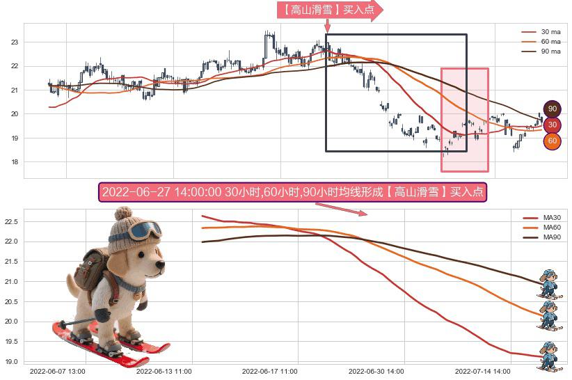 ⚀ 2022-06-13 14:00:00小时-2022-07-19 14:00:00小时显现 30小时-60小时-90小时均线 【高山滑雪】买入点 看多信号,后市看涨,买入