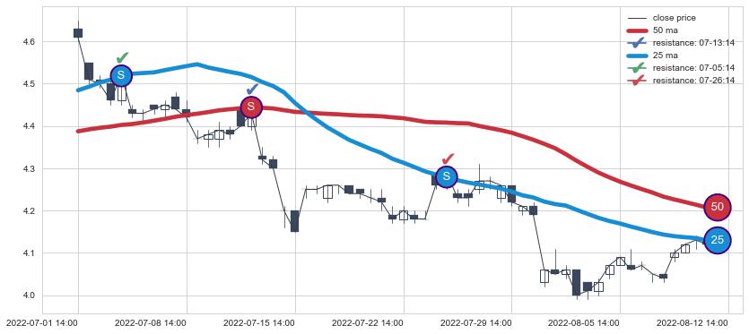 ⚀ 2022-06-14 14:00:00小时-2022-07-01 14:00:00小时显现 10小时-20小时-30小时均线 【战机起航】卖出点 看空信号,后市看跌,卖出
