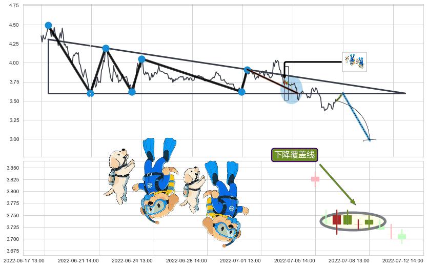 ➢ 【多方力量耗尽,空方打破攻守平衡点】下降三角形中继整理, 已在07-15:13突破【支撑】颈线 3.600 →演变成下降通道
