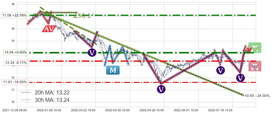♘ 阻力价格位14.04,可信任强度92.99%,距离最后交易2022-08-12 14:00形成的收盘价格13.91相差 +0.93%
