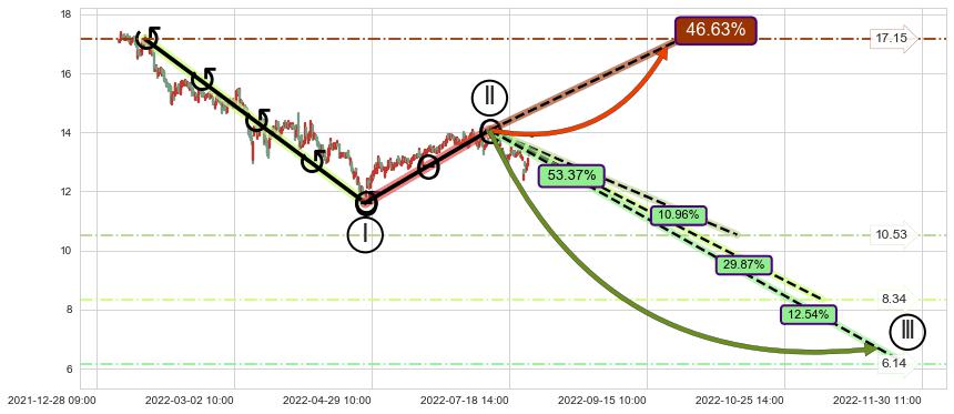 ➣ D点拟合预测价格14.81,距离最后交易收盘价格13.91相差 +6.43%