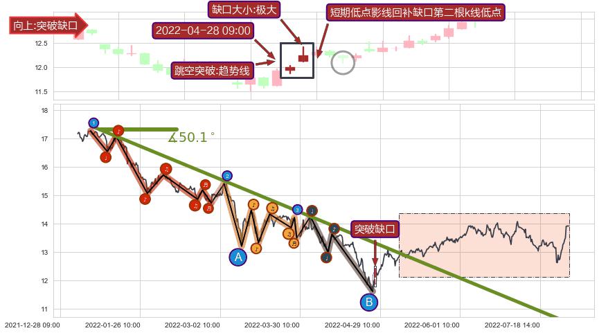 ➣ 2022-01-07 13:00-2022-05-06 09:00下跌趋势存在反转上涨[机会],其原下跌趋势的阻力位(10.50)已被突破[强支撑信号],原下跌趋势角度: 50.1˚