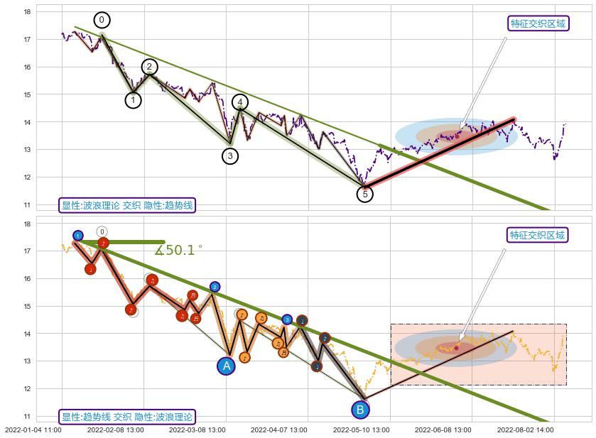 从2022-04-13 10:00至2022-06-13 09:00,共包含195个小时,阶段股价上涨2.96%,阶段股价变动位移路程比: 1 : 37