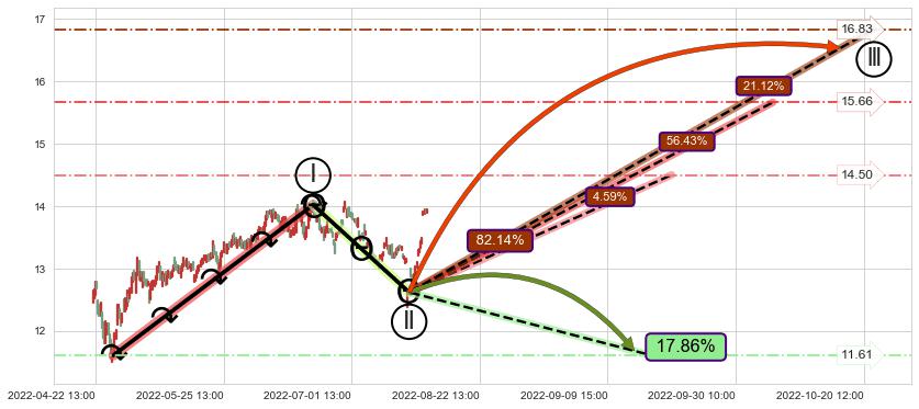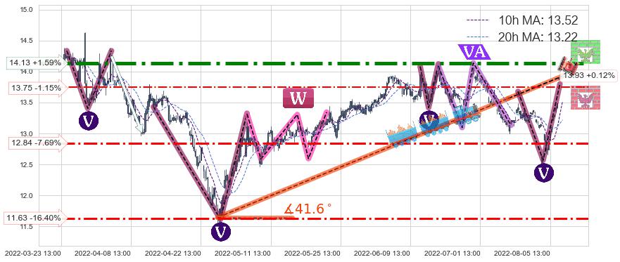 ♘ 阻力价格位14.13,可信任强度91.47%,距离最后交易2022-08-12 14:00形成的收盘价格13.91相差 +1.59%