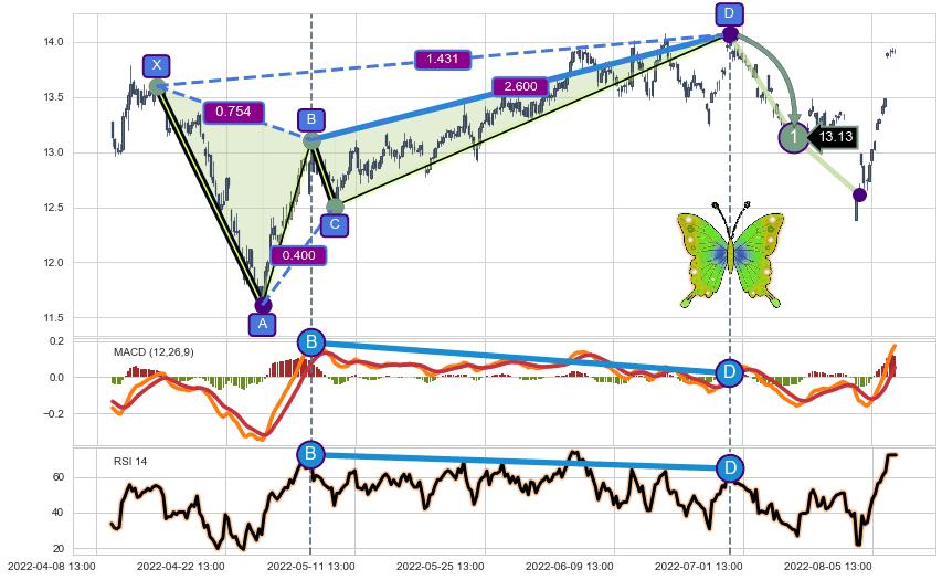 ➣ 已完成【蝴蝶】形态起点X: 04-15:10, 终点D: 06-28:14, 共223交易小时