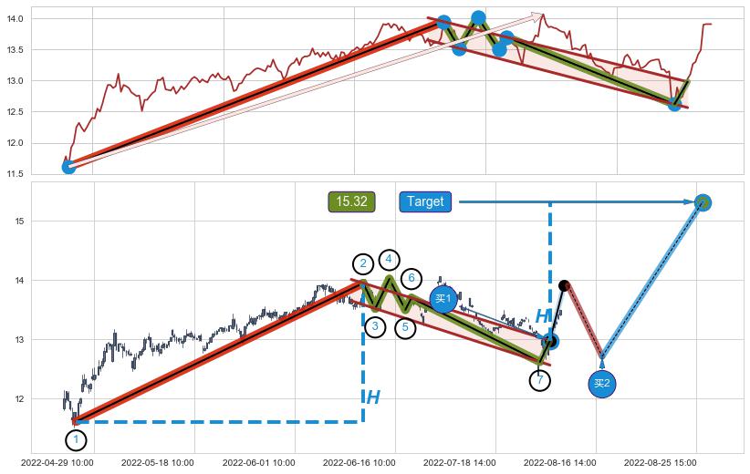 从2022-07-15 14:00至2022-08-12 14:00,共包含39个小时,阶段股价上涨6.76%,阶段股价变动位移路程比: 1 : 3