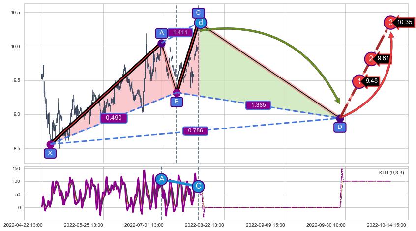 ➣ D点拟合预测价格8.94,距离最后交易收盘价格10.23相差 -12.57%