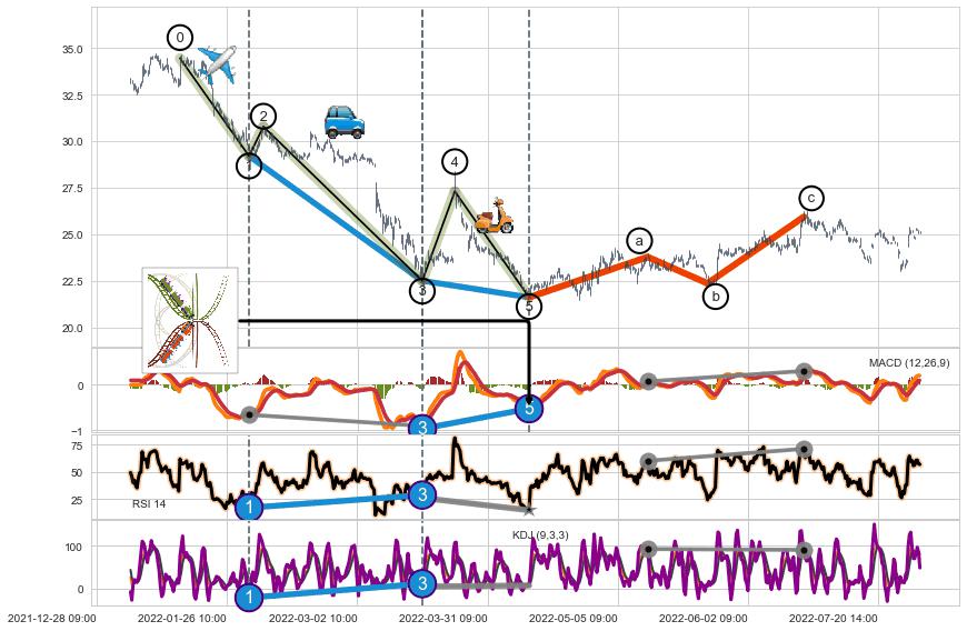 ➣ a,c调整浪MACD, RSI, KDJ走势都【未出现】背离,abc走势延续, 5浪反转概率增强
