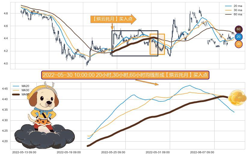 ⚀ 2022-05-19 13:00:00小时-2022-06-08 14:00:00小时显现 20小时-30小时-60小时均线 【烘云托月】买入点 看多信号,后市看涨,买入