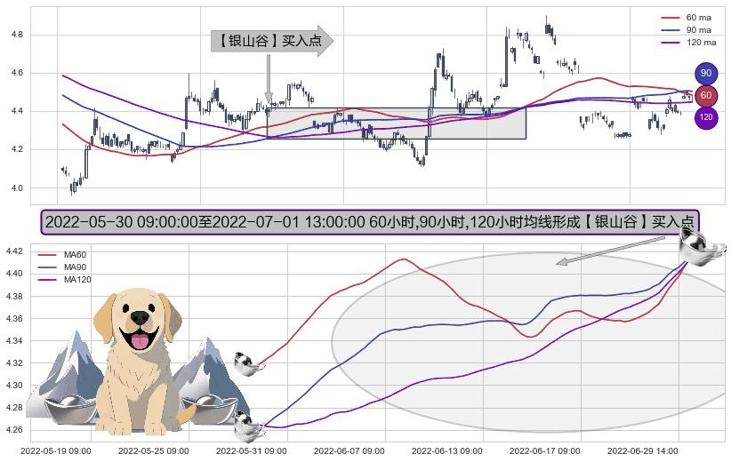 ⚀ 2022-05-30 10:00:00-小时至2022-07-01 13:00:00-小时显现 60小时-90小时-120小时均线 【银山谷】买入点 看多信号,后市看涨,买入