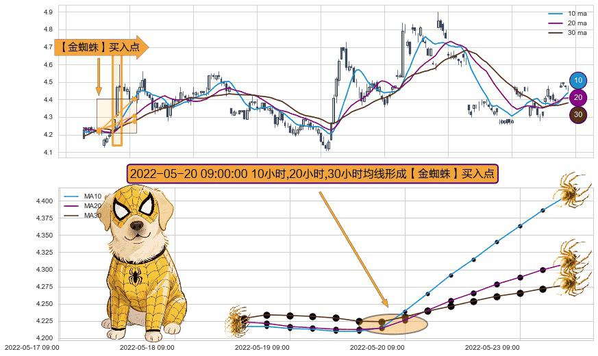 ⚀ 2022-05-20 09:00:00小时显现 10小时-20小时-30小时均线 【金蜘蛛】买入点 看多信号,后市看涨,买入