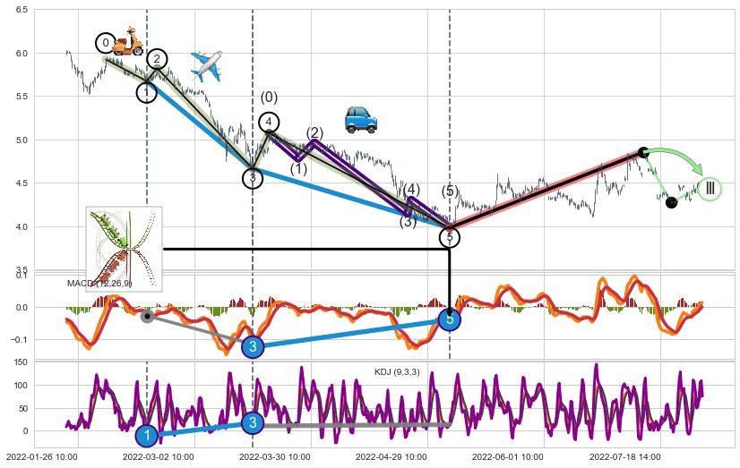 ➣ 第一, 三驱动浪端点:【KDJ】走势出现【常规背离 & 反转信号】背离程度36.31%,背离夹角角度95.4˚,背离程度较小