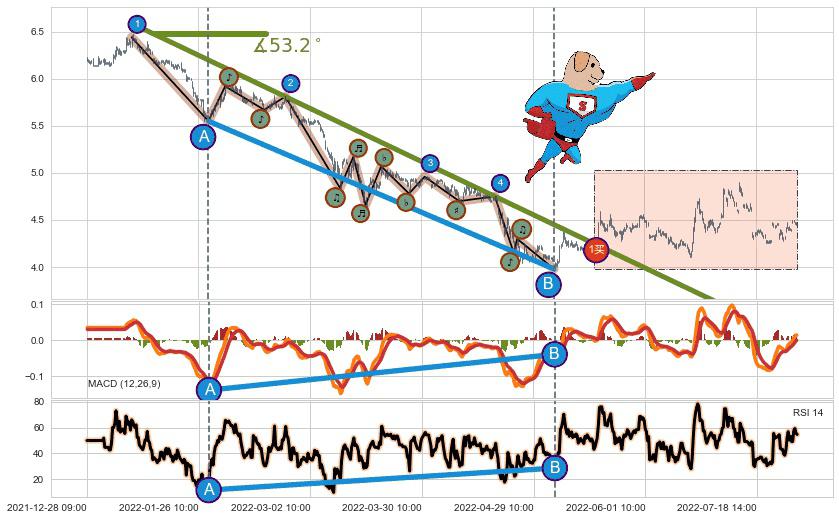 从2022-01-10 09:00至2022-05-11 11:00,共包含387个小时,阶段股价下跌-39.58%,阶段股价变动位移路程比: 1 : 5,下跌趋势角度: 53.2