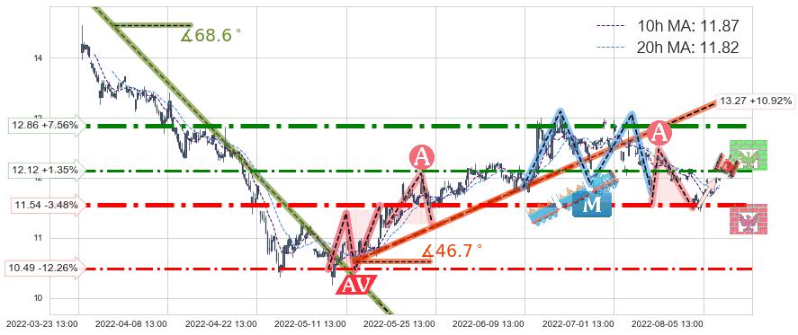 ➣ 【仅预测突破】最后价格:11.96与预测突破价格:11.61→【空间中等】后续最小【反转】第一目标价格→(08-19:13: 10.52 )