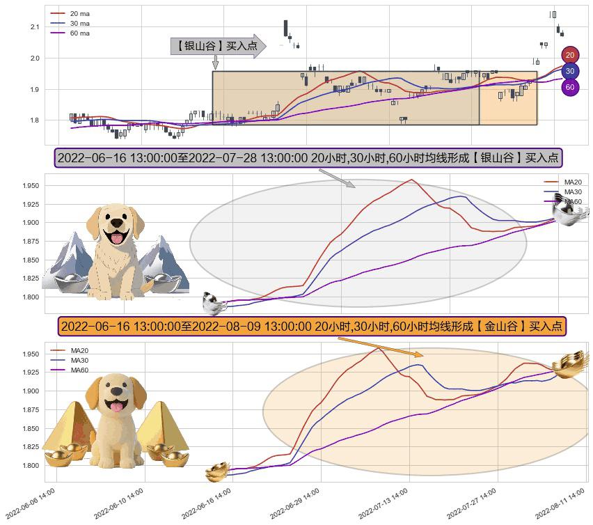⚃ 2022-06-16 14:00:00-小时至2022-08-09 13:00:00-小时显现 20小时-30小时-60小时均线 【金山谷】买入点 其再次确认了买入信号,可靠性更强,买入