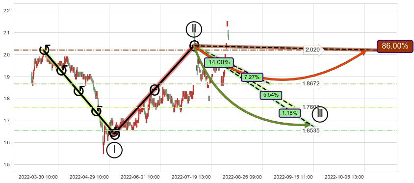 ➣ 调整浪已超过预测的c点位置,但后续大趋势循环浪高概率反转上涨,继续下跌概率14.00%,谨慎做空