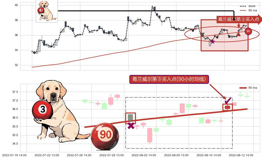 ⚀ 2022-08-11 13:00:00-小时显现 葛兰威尔均线 90小时均线 第③买入点 上升趋势的中继信号,后市看涨,买进信号