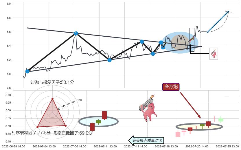 从2022-05-13 10:00至2022-07-25 13:00,共包含170个小时,阶段股价上涨11.12%,阶段股价变动位移路程比: 1 : 8,上涨趋势角度: 28.5,2022-07-22 13:00向⇪形成缺口,跳空上涨+2.53%