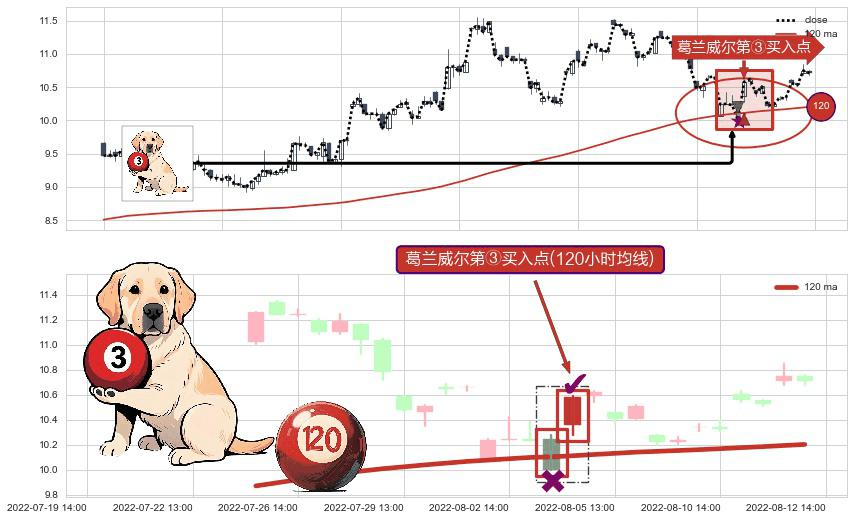 ⚀ 2022-08-04 13:00:00-小时显现 葛兰威尔均线 120小时均线 第③买入点 上升趋势的中继信号,后市看涨,买进信号