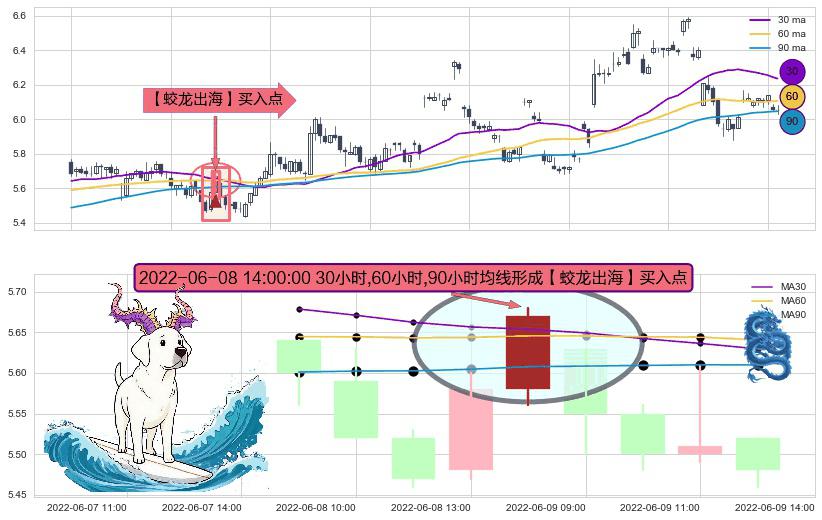 形态多维评估: ⚀ 2022-06-08 14:00:00小时显现 30小时-60小时-90小时均线 【蛟龙出海】买入点 看多信号,后市看涨,买入