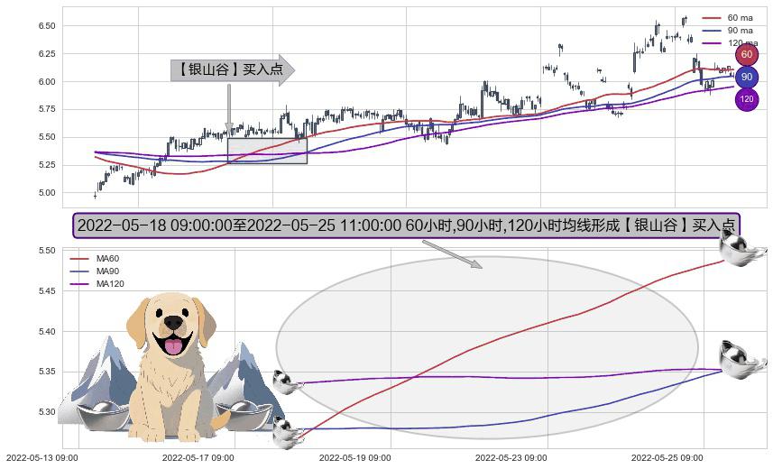 形态多维评估: ⚀ 2022-05-18 10:00:00-小时至2022-05-25 11:00:00-小时显现 60小时-90小时-120小时均线 【银山谷】买入点 看多信号,后市看涨,买入
