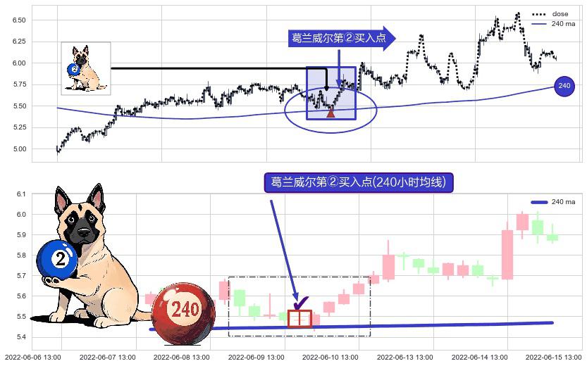 形态多维评估: ⚀ 2022-06-09 14:00:00-小时显现 葛兰威尔均线 240小时均线 第②买入点 上升趋势的中继信号,后市看涨,买进信号