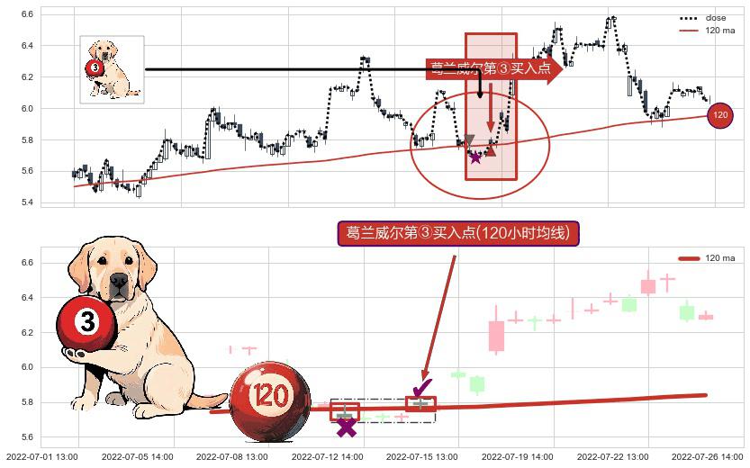 形态多维评估: ⚀ 2022-07-14 13:00:00-小时显现 葛兰威尔均线 120小时均线 第③买入点 上升趋势的中继信号,后市看涨,买进信号