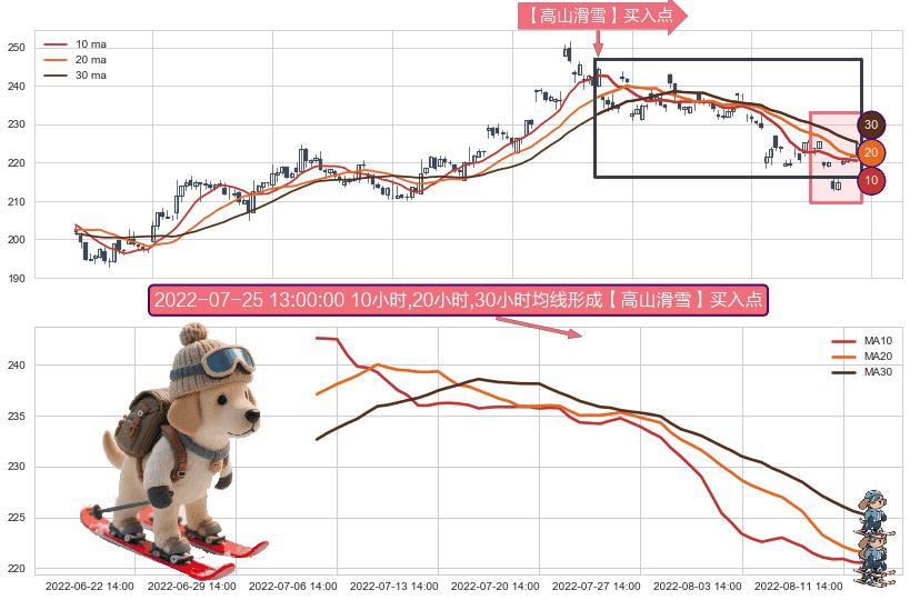 形态多维评估: ⚀ 2022-07-05 14:00:00小时-2022-08-12 14:00:00小时显现 10小时-20小时-30小时均线 【高山滑雪】买入点 看多信号,后市看涨,买入