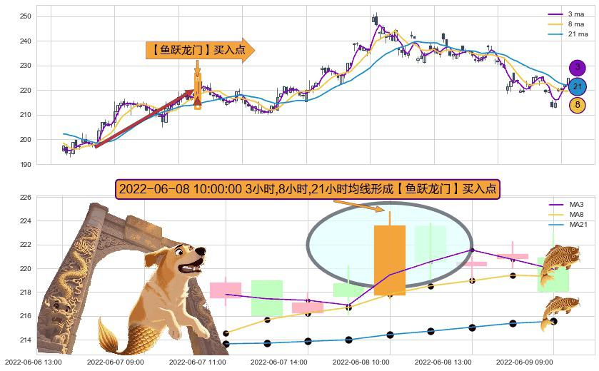 形态多维评估: ⚀ 2022-06-08 10:00:00小时显现 3小时-8小时-21小时均线 【鱼跃龙门】买入点 看多信号,后市看涨,买入