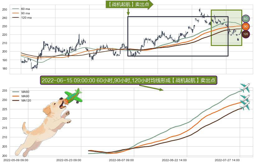 形态多维评估: ⚀ 2022-05-24 11:00:00小时-2022-07-28 14:00:00小时显现 60小时-90小时-120小时均线 【战机起航】卖出点 看空信号,后市看跌,卖出