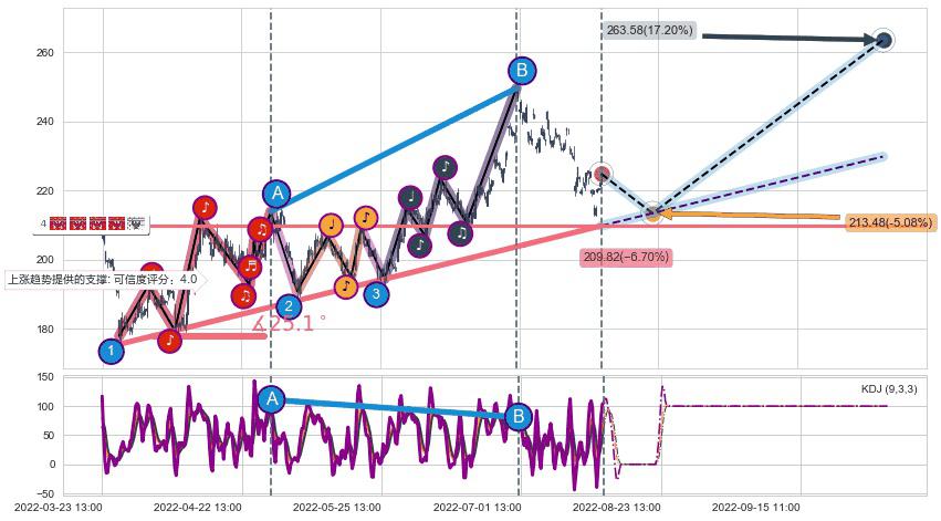 ♘ 在最后的上升阶段2022-03-23 13:00至2022-07-05 13:00存在 持续未破位的支撑位 ,支撑价格209.82,支撑可信任强度82.25%,其距离最后价格224.90相差 -6.70%