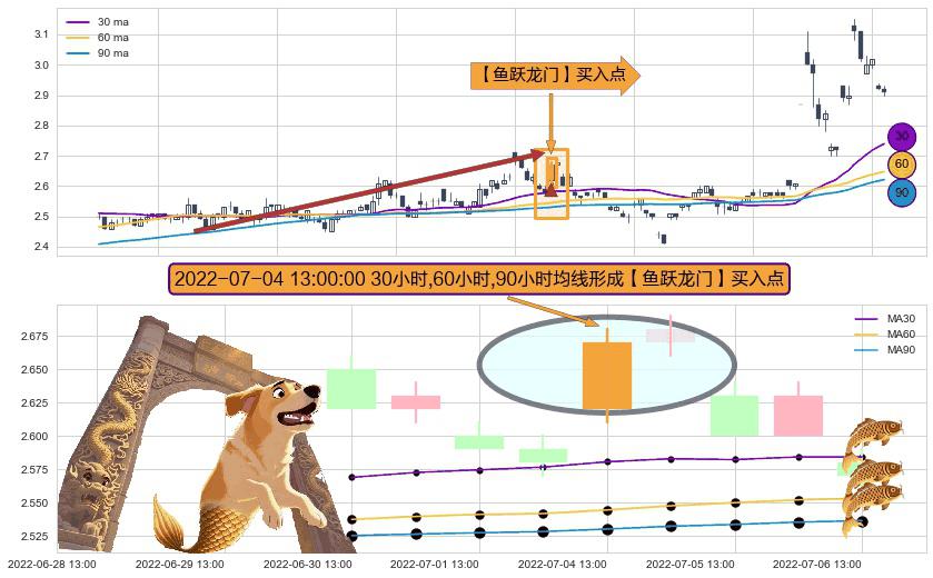 形态多维评估: ⚀ 2022-07-04 13:00:00小时显现 30小时-60小时-90小时均线 【鱼跃龙门】买入点 看多信号,后市看涨,买入