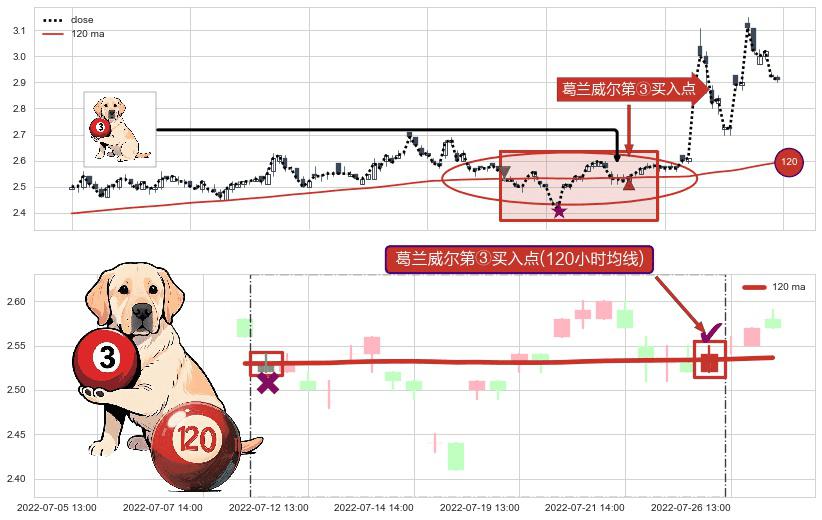 形态多维评估: ⚀ 2022-07-25 14:00:00-小时显现 葛兰威尔均线 120小时均线 第③买入点 上升趋势的中继信号,后市看涨,买进信号
