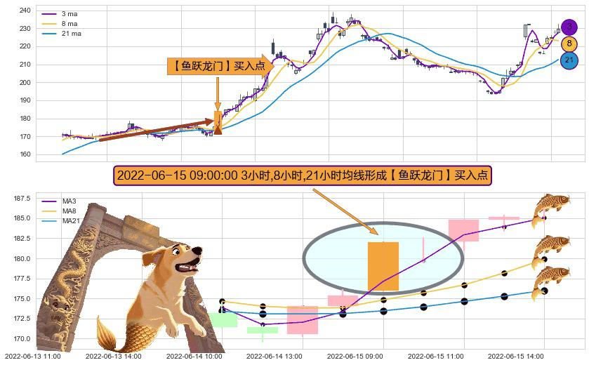 ⚀ 2022-06-15 09:00:00小时显现 3小时-8小时-21小时均线 【鱼跃龙门】买入点 看多信号,后市看涨,买入