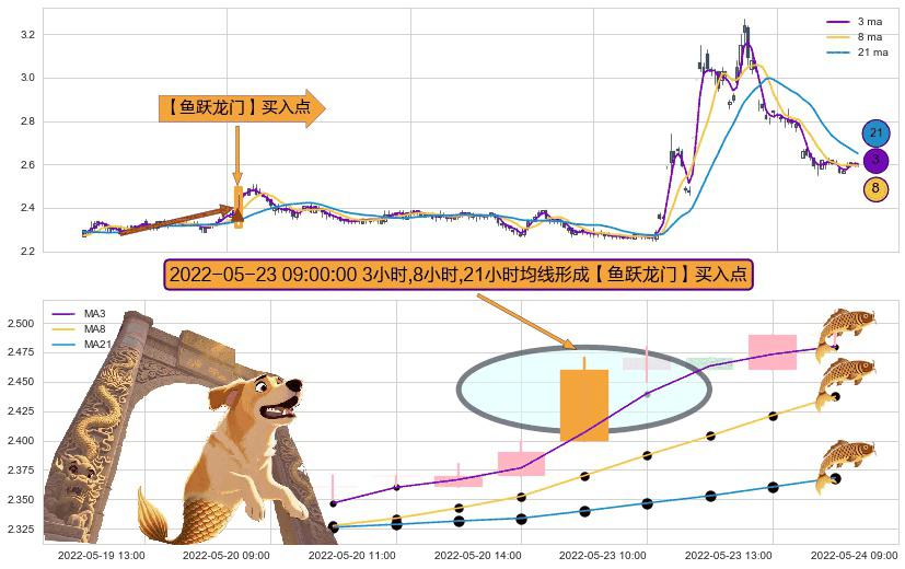 ⚀ 2022-05-23 09:00:00小时显现 3小时-8小时-21小时均线 【鱼跃龙门】买入点 看多信号,后市看涨,买入